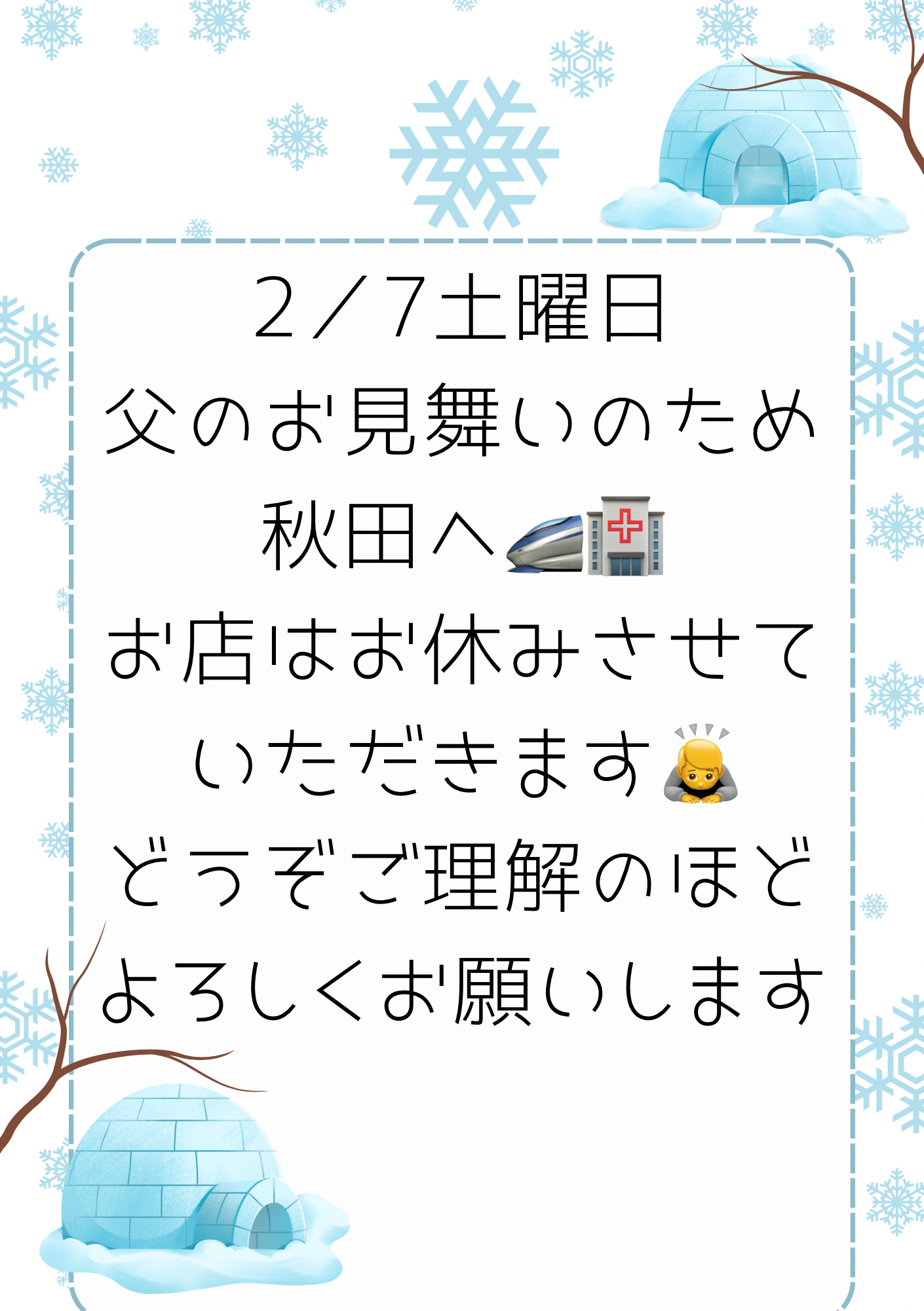 明日2/7日土曜日はお休みさせていただきます🙇